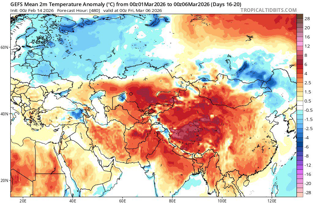 Примечание. Американская ансамблевая система прогнозирования GEFS, которая объединяет результаты 30 отдельных прогнозов, предсказывает, что на значительной части нашего региона с 1 по 6 марта температура будет на 1-3 градуса ниже нормы.