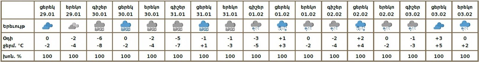 30 января в низинных участках Ширакской равнины, предгорьях Арагацотна и Котайка, на Араратской равнине, в том числе и в Ереване, ожидается туман. В ночь на 30 января и в утренние часы на автомобильных дорогах республики ожидается гололедица.