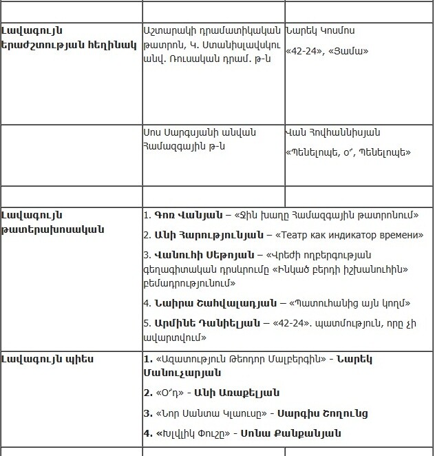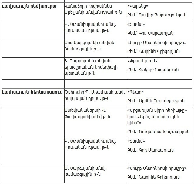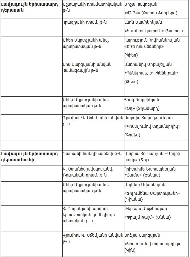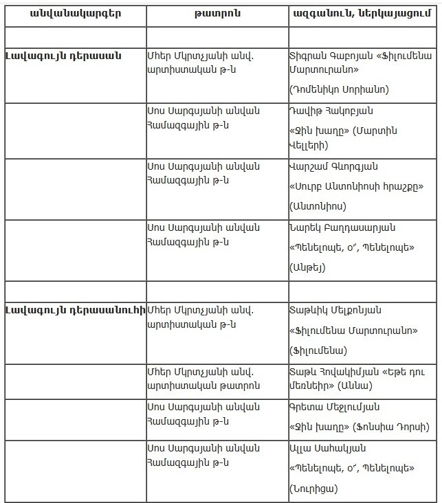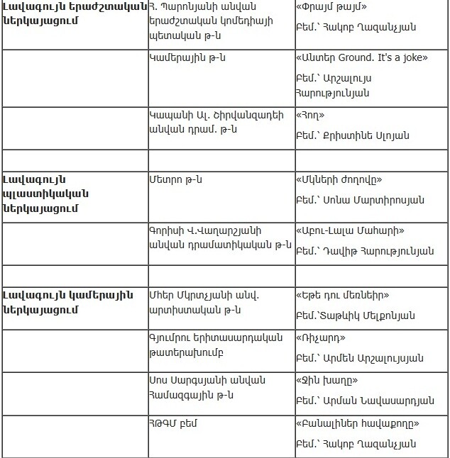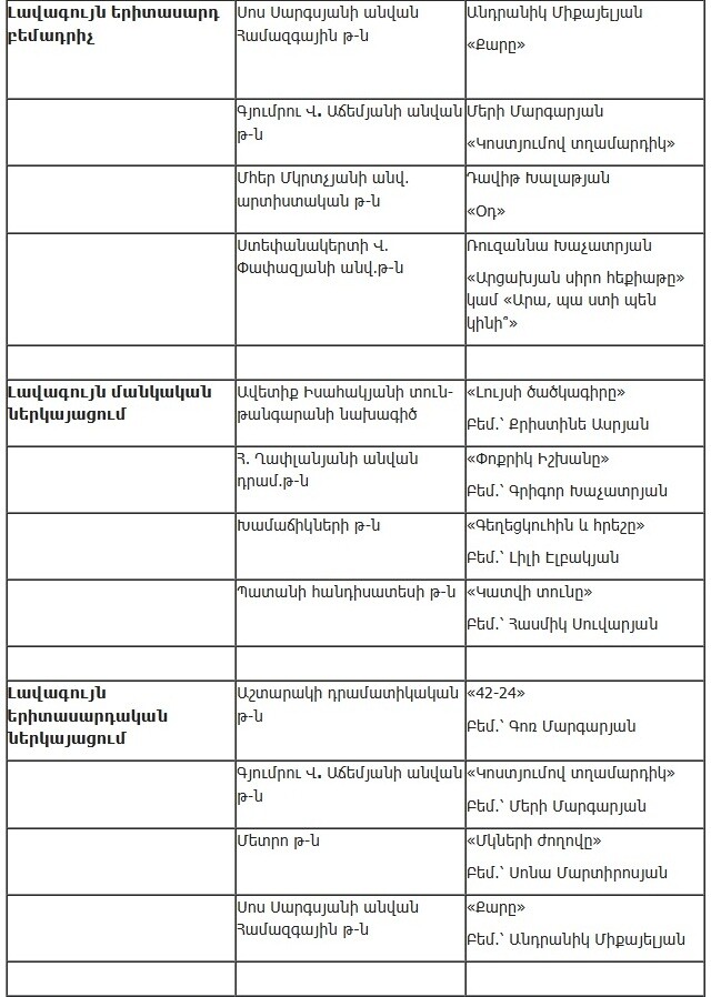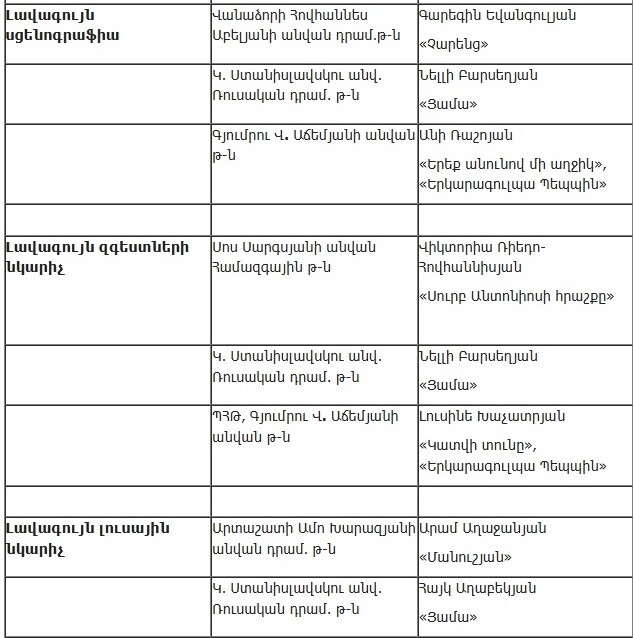 Союз театральных деятелей Армении опубликовал список работ, прошедших во второй этап ежегодной театральной премии «Артавазд», который представлен ниже.
