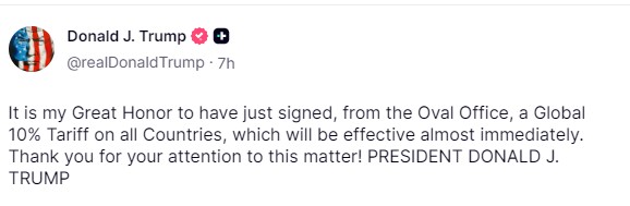 «Для меня большая честь только что подписать из Овального кабинета указ об установлении всеобщей 10-процентной пошлины на все страны, который вступит в силу почти немедленно. Благодарю вас за внимание к этому вопросу», — написал Трамп.