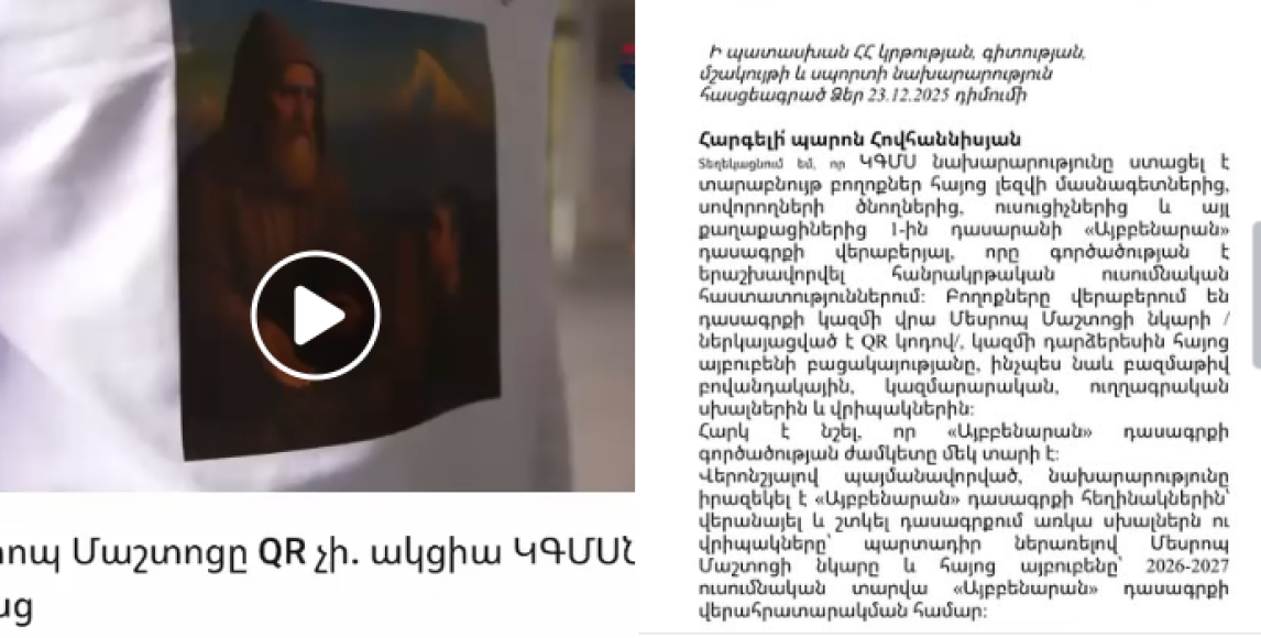 Հիշեցնում եմ, որ 2025 թվականի հոկտեմբերի 23-ին «Հայրենիք» կուսակցության երիտասարդ անդամները ԿԳՄՍ նախարարության շենքի դիմաց իրականացրեցին «Այբ Արարատ» խորագրով մշակութային բողոքի ակցիա, որը ուներ հստակ պահանջ՝ վերացնել QR կոդը այբբենարաններից