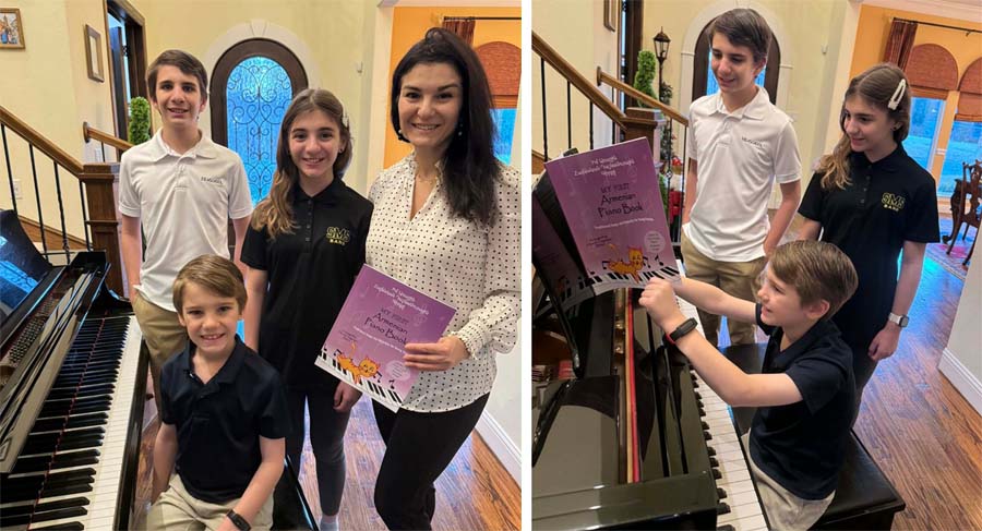 Լուսանկարում՝ Հասմիկ Գրիգորյան-Բելիչը, ձեռքում՝ «Իմ առաջին հայկական դաշնամուրային գիրքը», կողքին՝ Էվան, Վինը, դաշնամուրի նստարանին՝ Ալեքսը