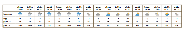 Երևան քաղաքում հունվարի 18-ի ցերեկը, 19-20-ին սպասվում է ձյուն։ Հունվարի 21-23-ին սպասվում է առանց տեղումների եղանակ: Այս մասին հայտնում են Հիդրոօդերևութաբանության և մոնիթորինգի կենտրոնից։